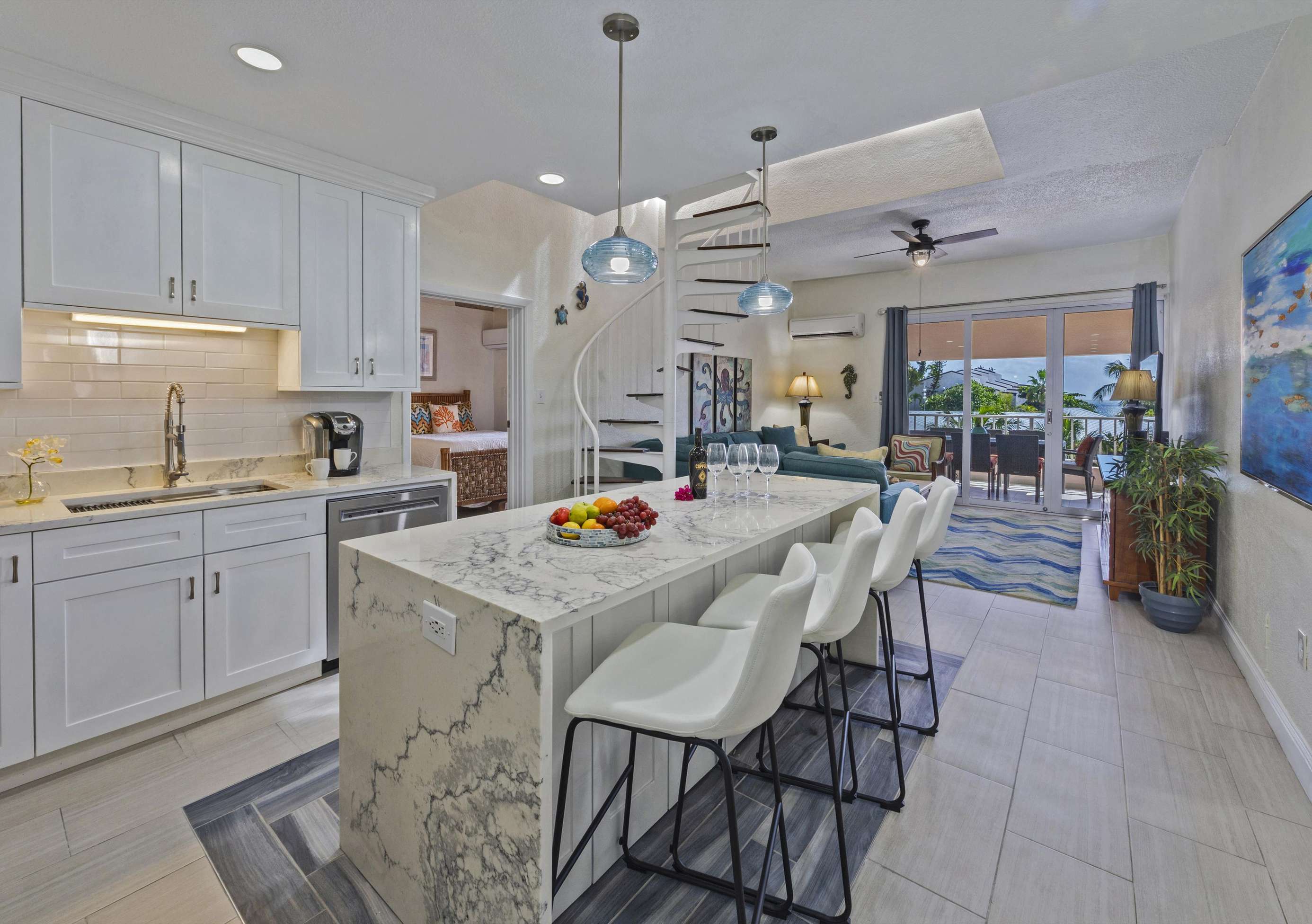 Back inside 'Caribbean Dream', the fully equipped, new modern and open kitchen has everything you need to prepare a delicious meal. Take in the gorgeous views from any of the four patios and stargaze on a clear night or sunbathe during the day on the awesome upper deck.